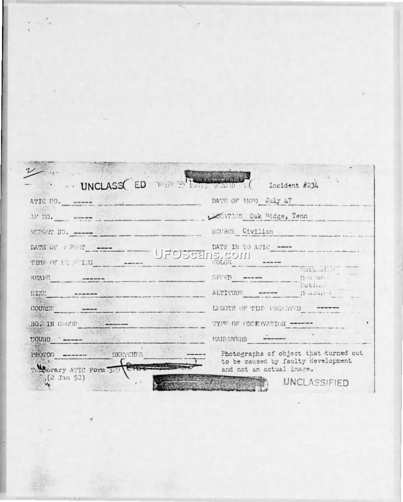Incident #234 — Photographs of 'Flying Saucer' — Oak Ridge, Tennessee, July 1947