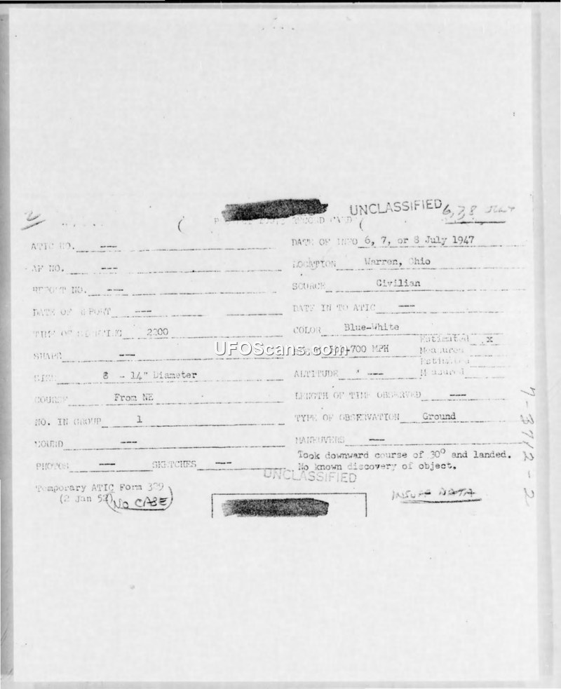 A 1947 sighting report from Warren, Ohio, detailing a blue-white object that performed a landing maneuver. The case was ultimately classified as having no known discovery of the object.