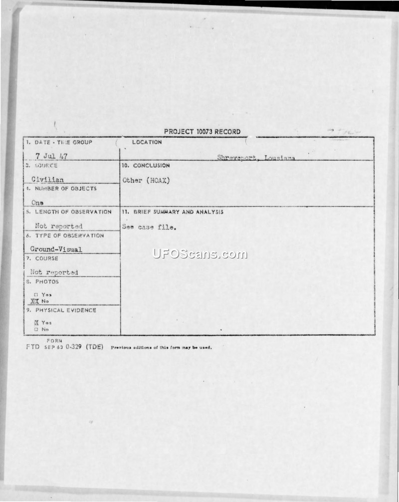 Project 10073 Record — Flying Disc Found in Shreveport, Louisiana, 7 July 1947