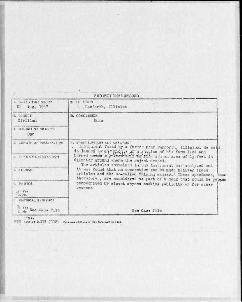 Project 10073 Record: Flying Saucer Hoax, Danforth, Illinois