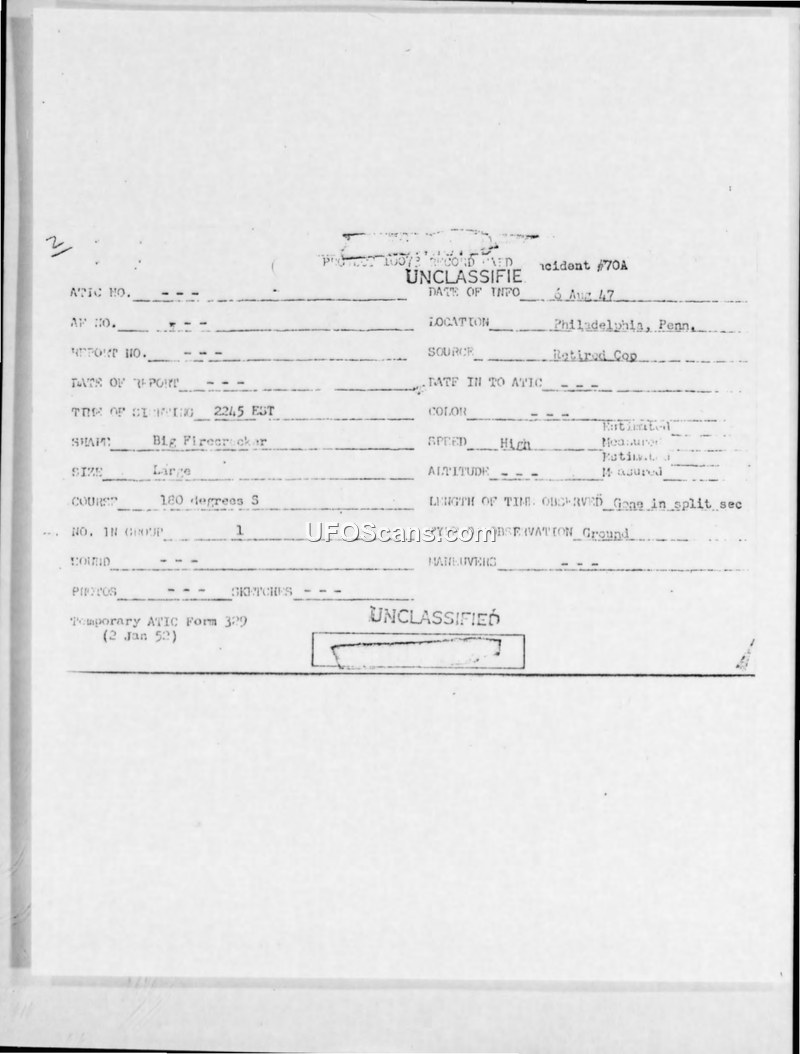Incident #69, 69a, and 70/70a Sighting Reports — Philadelphia, Pennsylvania, August 1947