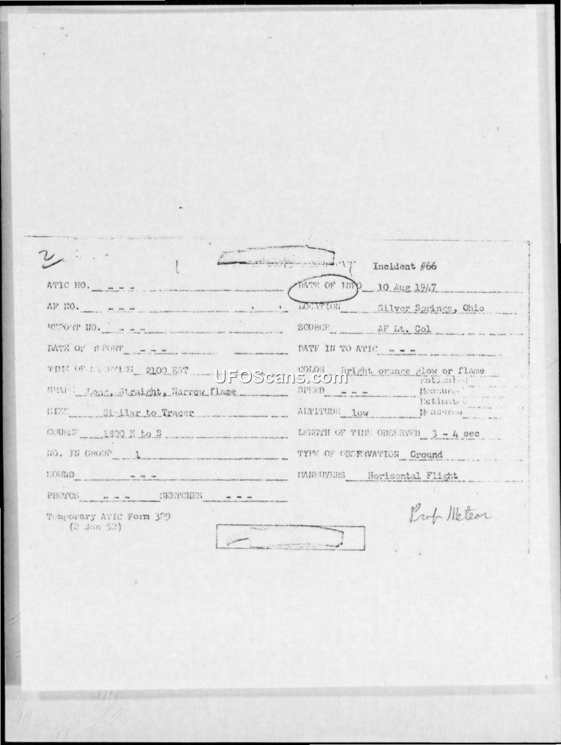 Incident #66 involves an Air Force officer's report of a bright, orange, flame-like object seen over Silver Springs, Ohio, in 1947. The official military evaluation concluded the object was a meteor.