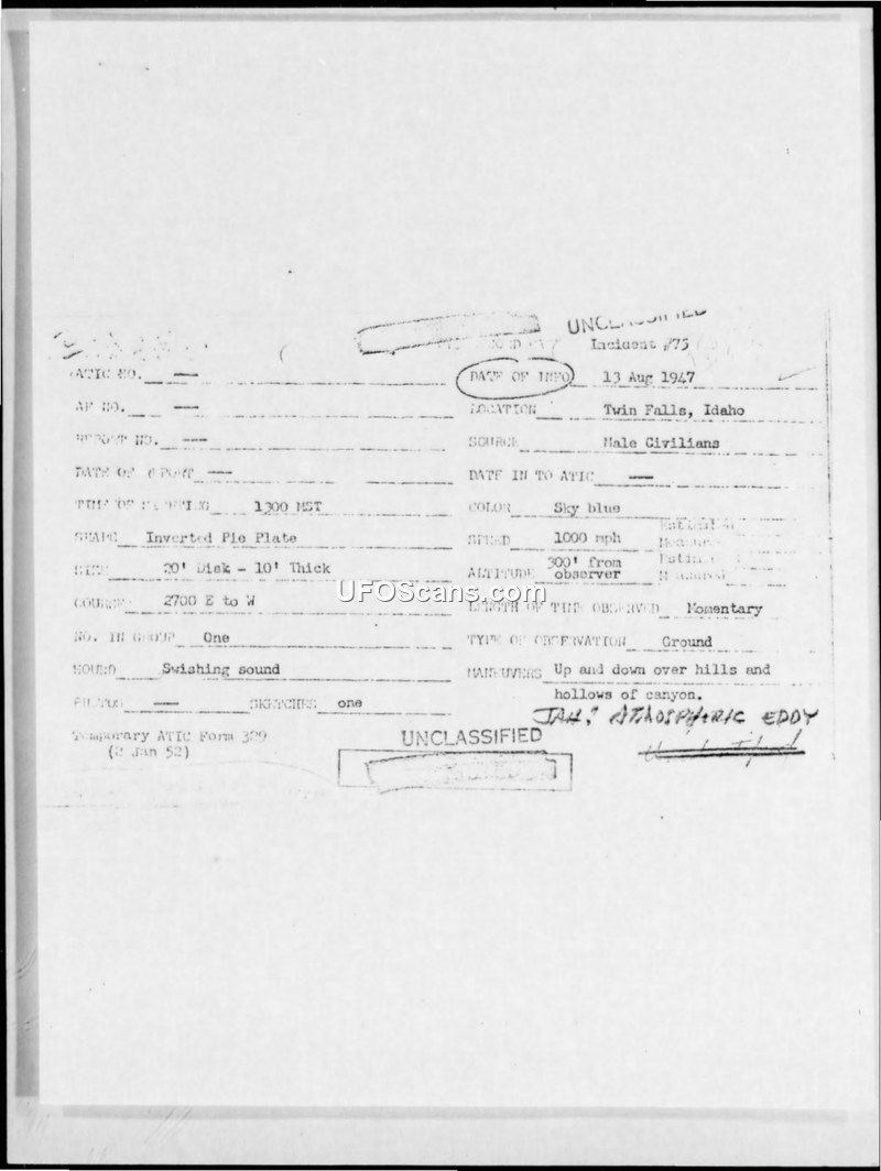 Incident #75 Sighting Report — Snake River Canyon, Idaho, August 13, 1947