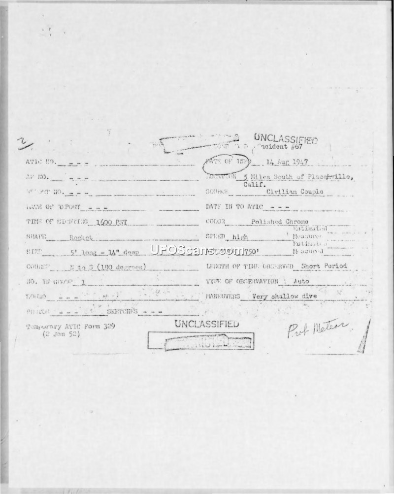 Incident #67 Sighting Report — Near Placerville, California, 14 August 1947