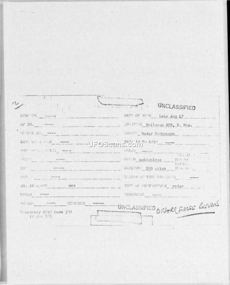 The sightings at Holloman AFB were investigated by Air Materiel Command. While some radar returns were dismissed as equipment 'ghosts' or atmospheric effects, other sightings by trained observers remained unexplained.