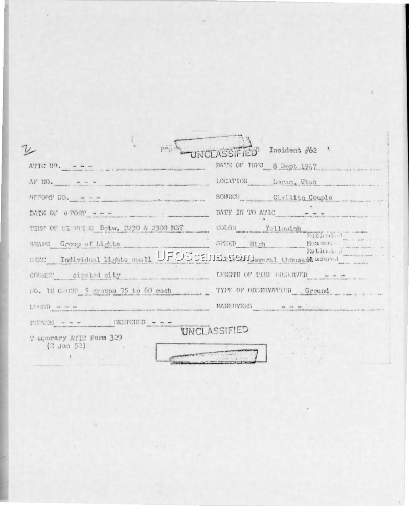 This document contains reports and evaluations regarding Incident #62, which occurred in Logan, Utah, on the night of September 8, 1947. Between 2230 and 2300 MST, a man and his wife, accompanied by five other unidentified individuals, observed five distinct groups of objects in the sky. Each group was estimated to contain between 35 and 60 small, yellowish-white lights. The witnesses reported that these objects circled the city at an altitude of several thousand feet and exhibited high speed. The weather at the time was described as cloudy. The official ATIC opinion on the incident states that it is practically impossible to formulate a definitive conclusion based on the limited evidence provided. The report suggests that the perceived fast motion of the objects could be an illusion caused by the proximity of the objects rather than their actual linear speed. Furthermore, the investigators proposed that the lights might have been ground lights reflected off low-hanging, invisible clouds, or potentially light-colored birds. The document also references Incident #61, noting that both incidents clearly refer to the same set of objects, as the witnesses for both were together at the time of the observation. Dr. Hynek's evaluations, extracted from the Project Grudge report, categorize this incident among those where a lack of evidence precludes a definitive explanation. The file includes various administrative forms, including a Temporary ATIC Form 329 dated January 2, 1952, and checklists detailing the observation parameters, such as the location (40° 45' N 111° 54' W) and the witnesses' initial impression that the objects were the lights of a plane, which was later reconsidered due to the objects' formation changes and speed.