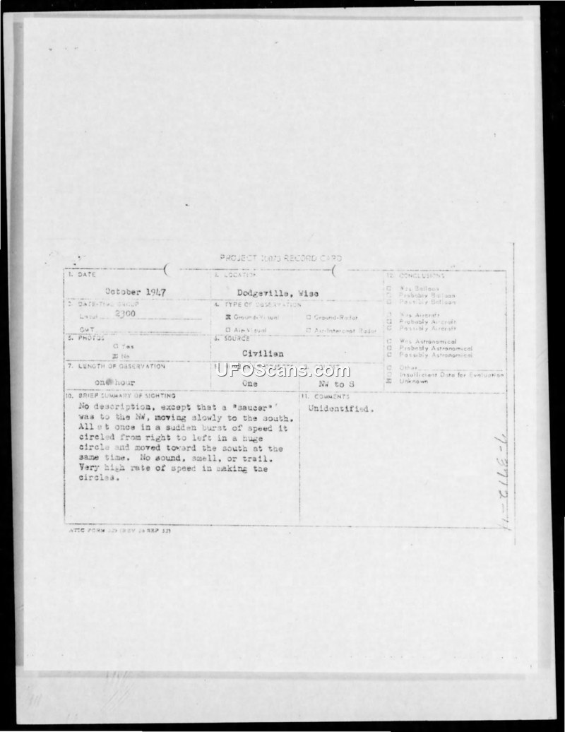 A civilian reported observing a 'saucer' in Dodgeville, Wisconsin, in October 1947. The object moved slowly before performing a high-speed circular maneuver, and the incident remains officially classified as unidentified.