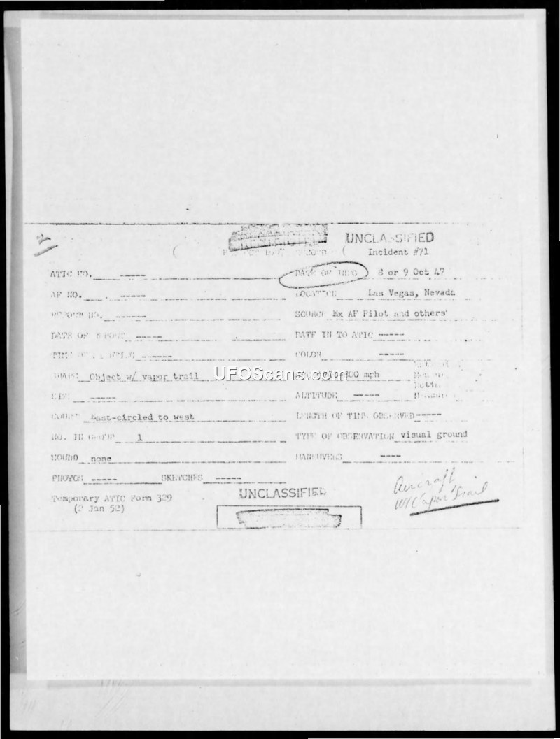 Incident #71 involves an Air Force Reserve pilot's report of a high-altitude object leaving a vapor trail over Las Vegas in 1947. The Air Materiel Command concluded the object was an ordinary aircraft, dismissing the witness's concern.