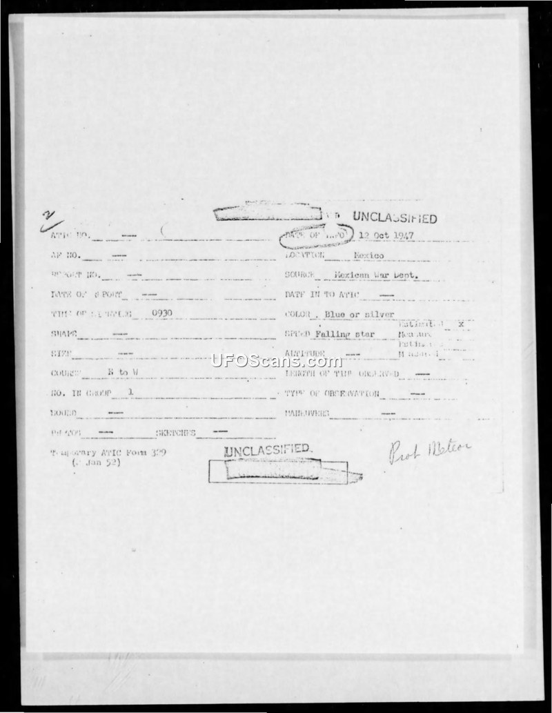 This collection of documents details the investigation into an unidentified flaming object reported to have crashed in the Samalayuca Mountains of Mexico on October 12, 1947. The incident generated significant attention, with initial reports describing a mysterious object that blazed through the sky and exploded upon impact. The Mexican War Department and local military officials, including Teniente Enrique Diaz Gonzales of the Juarez military garrison, were involved in the search for the crash site. The United States Air Force, through the Air Materiel Command and the Analysis Division (T-2), initiated a series of teletype communications to coordinate information regarding the event. The investigation sought to determine if the object was related to U.S. military activities, specifically missile testing. The final assessment, as reflected in the correspondence, concluded that the object was a V-2 rocket launched from a U.S. Army experimental station in Texas. This conclusion was supported by reports from the White Sands Proving Ground regarding missile launches on October 3 and October 9, 1947. The documents also include an incident index from a Project Grudge report, which categorizes various sightings, including this one, as falling bodies or rockets. The records demonstrate the inter-agency coordination between U.S. and Mexican authorities to clarify the nature of the aerial phenomenon and mitigate concerns regarding the unauthorized entry of a missile into Mexican territory.