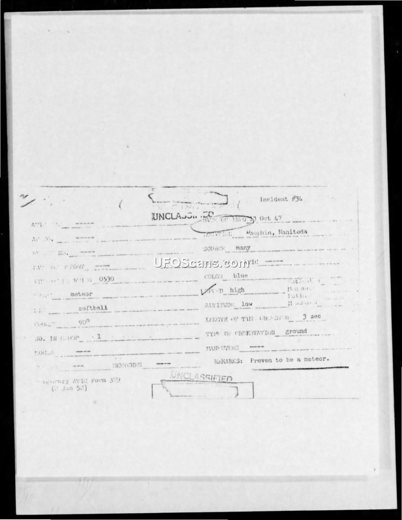 Incident #34 describes a 1947 sighting in Dauphin, Manitoba, which was officially evaluated by ATIC as a meteor. The report includes witness observations and a summary of the characteristics that led to this conclusion.