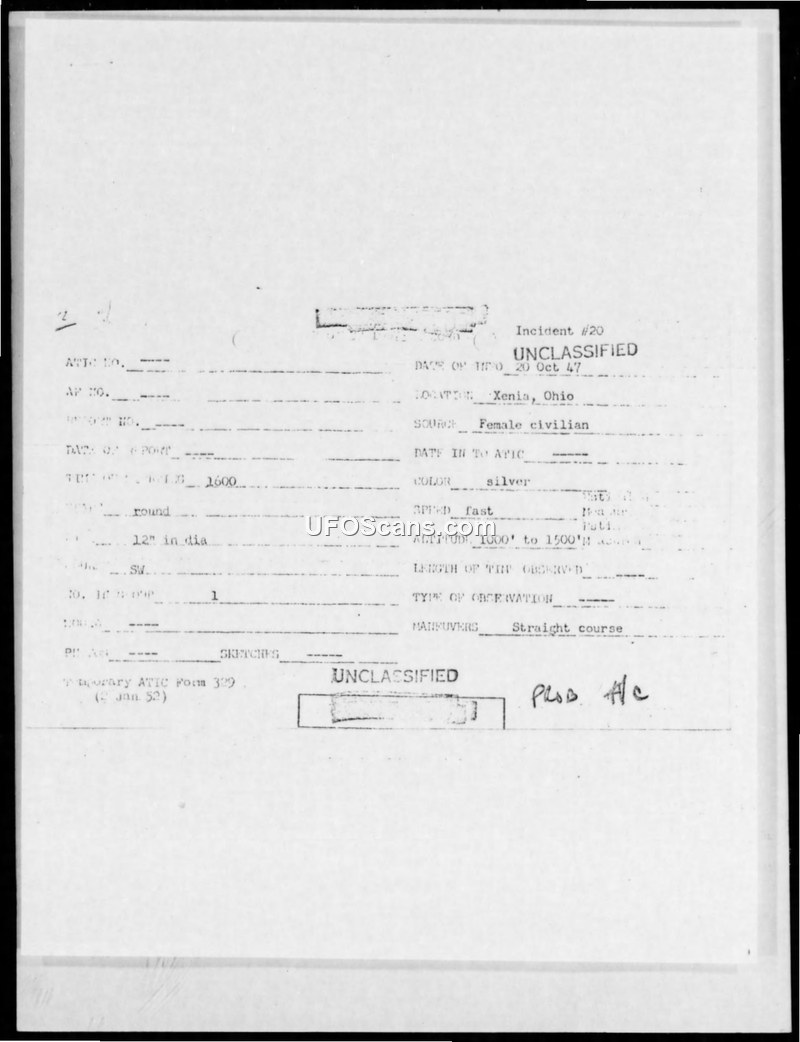 Incident #20 Sighting Report — Xenia, Ohio, 20 October 1947