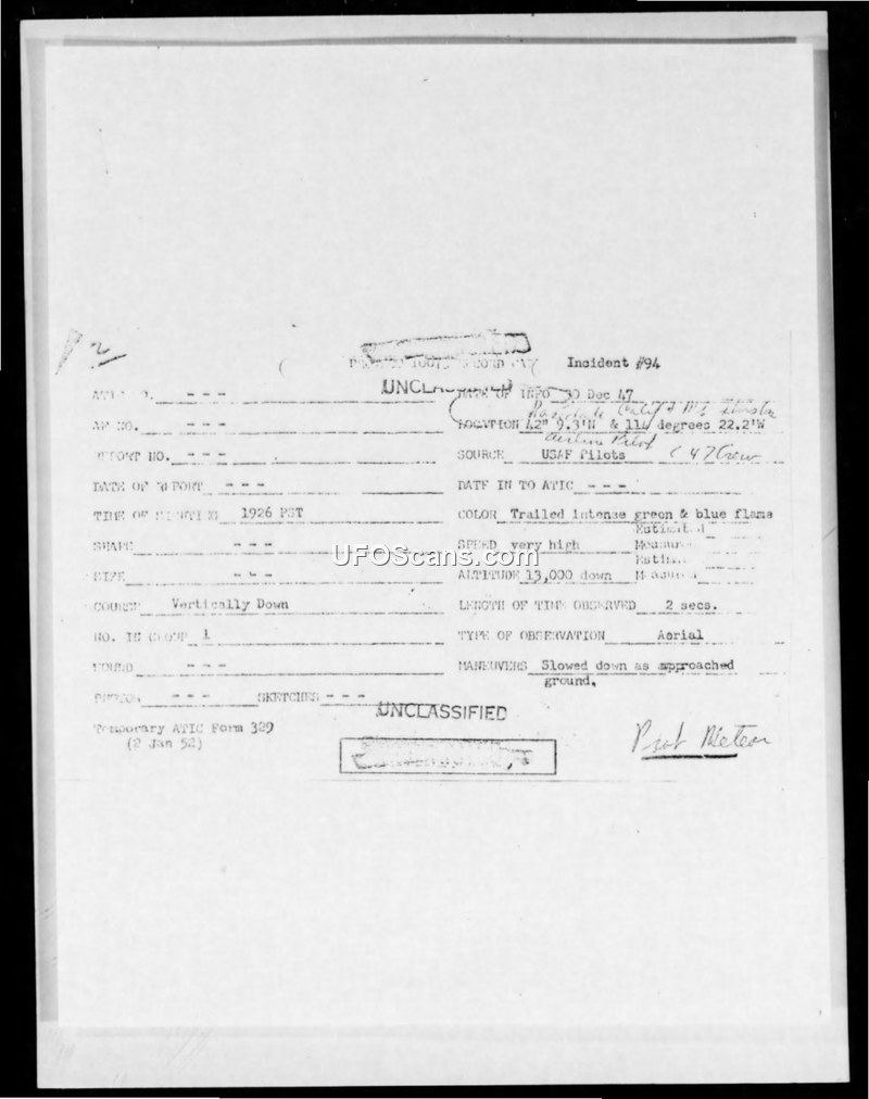 A 1947 sighting report by a C47 crew of a high-speed object trailing green and blue flames. The incident was officially classified as a probable meteor.