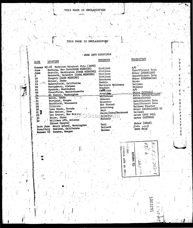 This document is a chronological log of UAP/UFO sightings reported from June to December 1947. It categorizes these reports by date, location, observer, and official evaluation, providing a snapshot of the investigative process during that period.