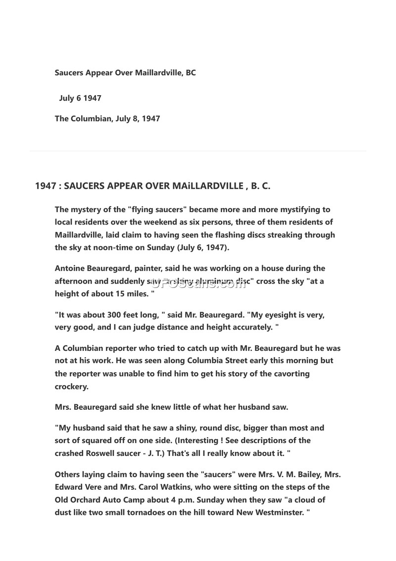 This document is a newspaper report from The Columbian, dated July 8, 1947, detailing sightings of 'flying saucers' in Maillardville, British Columbia, on July 6, 1947. The report notes that six individuals claimed to have seen the objects. Antoine Beauregard, a local painter, reported seeing a 'shiny aluminum disc' at an altitude of approximately 15 miles, which he estimated to be 300 feet long. His wife, Mrs. Beauregard, provided a slightly different description, noting her husband described it as a 'shiny, round disc, bigger than most and sort of squared off on one side,' while also referencing the 'crashed Roswell saucer.' Additionally, three other witnesses—Mrs. V. M. Bailey, Mrs. Edward Vere, and Mrs. Carol Watkins—reported seeing a 'cloud of dust like two small tornadoes' near New Westminster at 4 p.m. on the same day. A follow-up note indicates that, according to their report, 'three discs then pulled up from behind the trees.' The reporter for The Columbian attempted to interview Mr. Beauregard but was unsuccessful.
