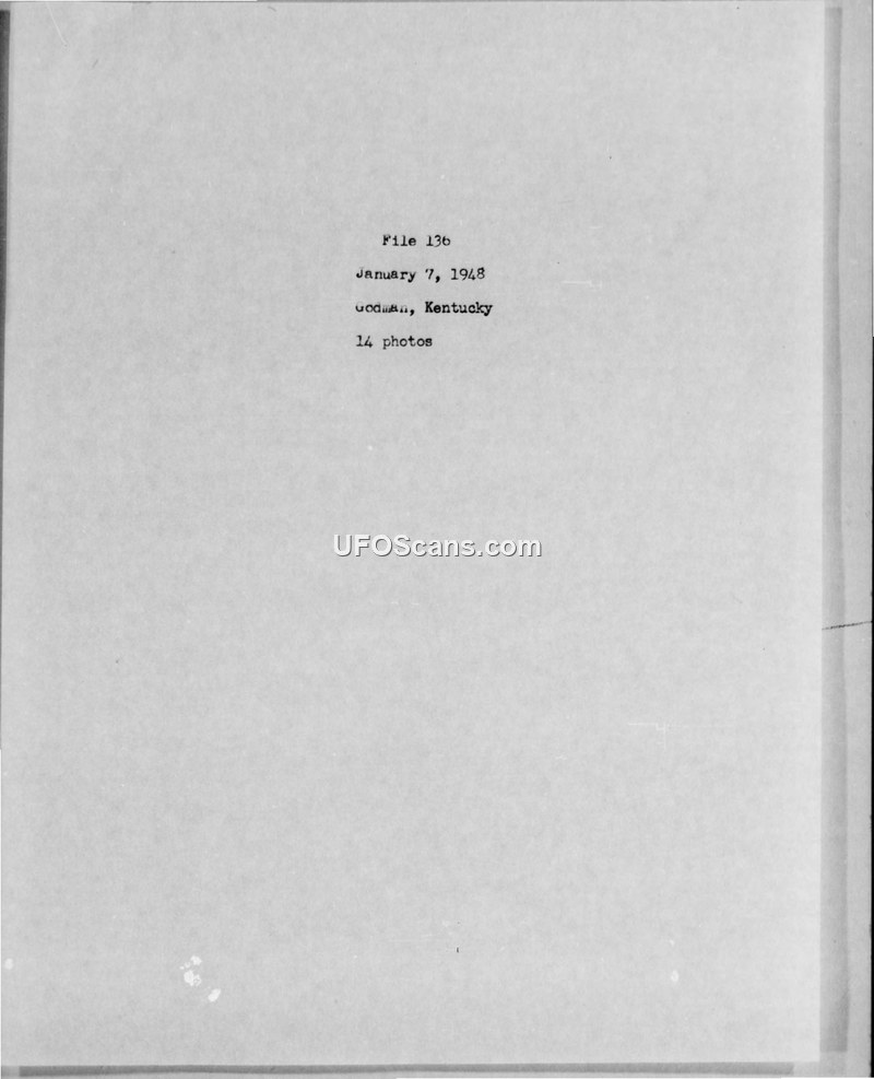 This document, identified as File 136, consists of a cover page and 16 photographic images documenting an aircraft crash site in Godman, Kentucky, dated January 7, 1948. The text provided is minimal, serving primarily as a label for the photographic evidence contained within the file. The photographs depict various pieces of metallic aircraft wreckage scattered across a field, including what appears to be a landing gear assembly, fuselage sections, and wing components. Some images show the wreckage in a wooded or rural area, while others show the debris in a more open field near a small structure. The document does not provide a narrative report, witness statements, or an official assessment of the incident, focusing entirely on the visual documentation of the crash site.