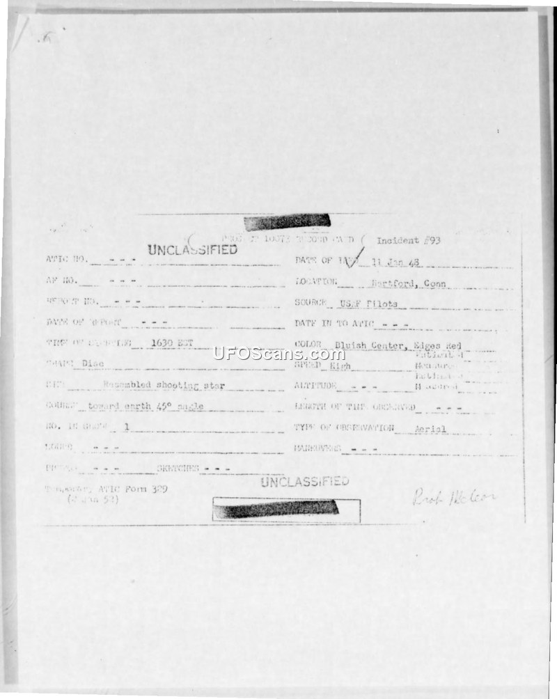 Incident #93 Sighting Report — Hartford, Connecticut, 11 January 1948