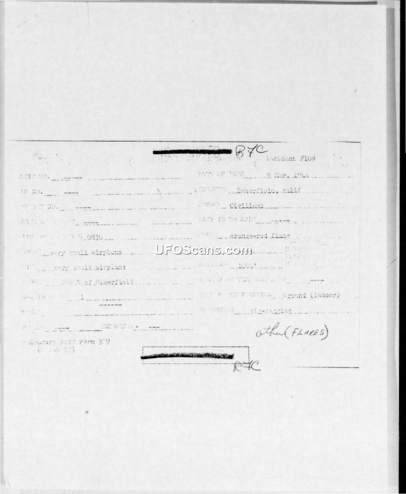 A report from the Fourth Air Force detailing a 9 March 1948 sighting of a flaming, zigzagging object over Bakersfield, California. The military concluded the activity was likely attributable to marker flares.
