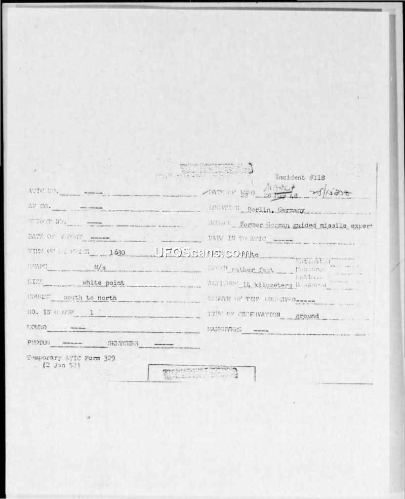 Incident #118 Sighting Report — Berlin, Germany, March 1948