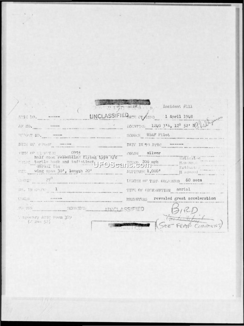 This document details a 1948 sighting of an unidentified aerial object by a U.S. Air Force pilot in the Philippines. The military investigation concluded the object was likely a bird.