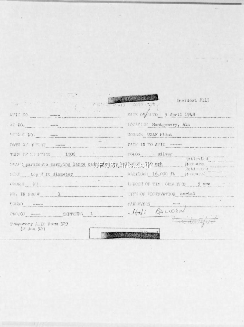 Incident #113 Sighting Report — Montgomery, Alabama, 9 April 1948