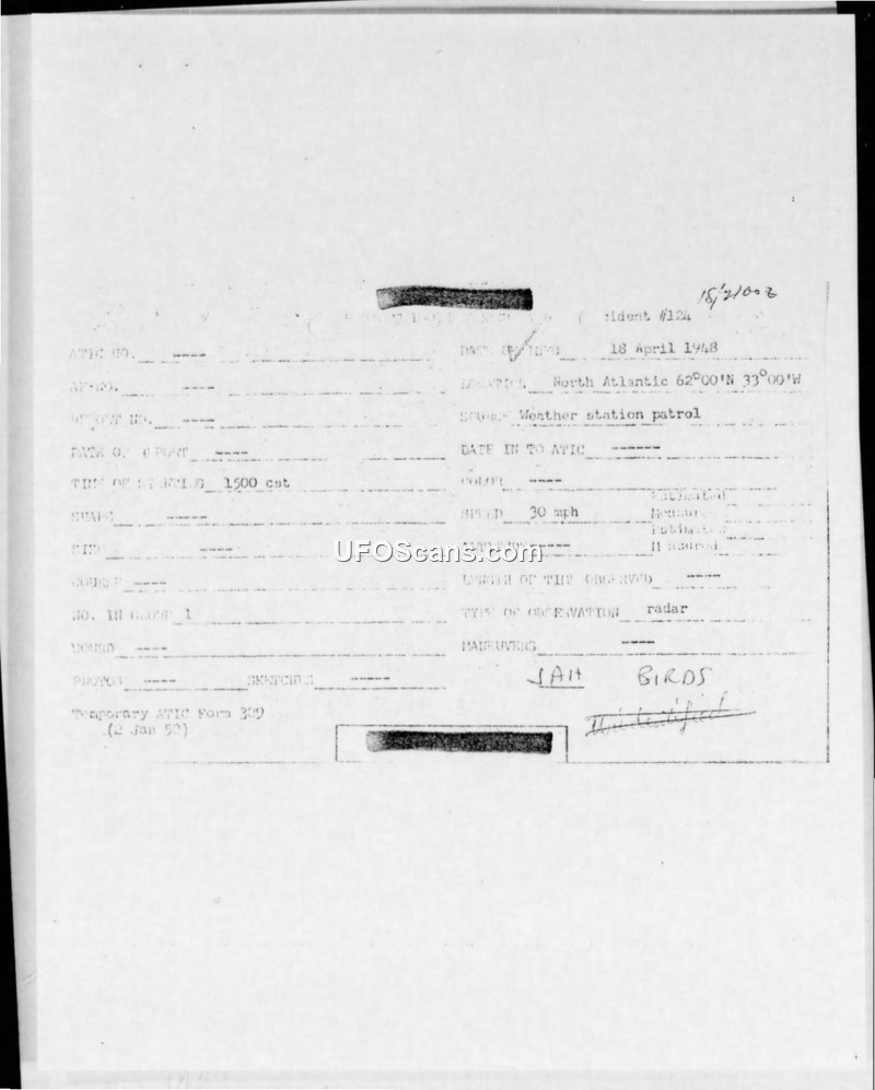 Incident #124 Sighting Report — North Atlantic, 18 April 1948