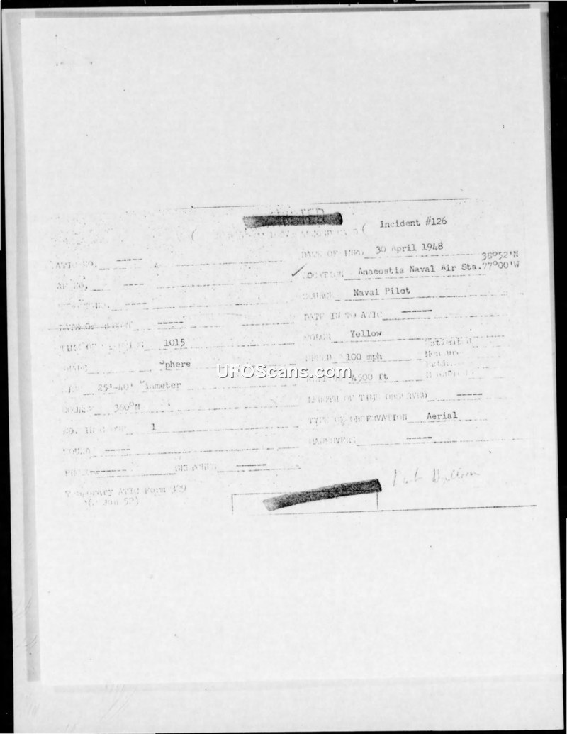 Incident #126 Sighting Report — Anacostia Naval Air Station, 30 April 1948