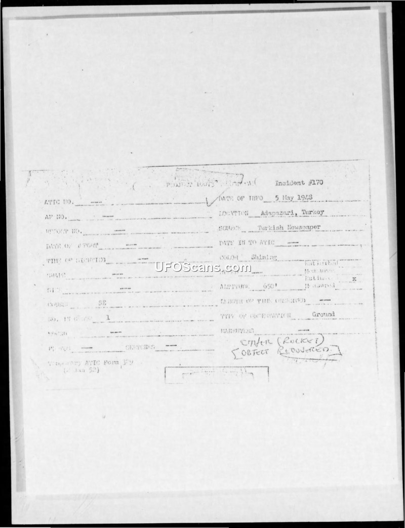 This document details Incident #170, which occurred around 5 May 1948 near Adapazari, Turkey. According to reports extracted from the Turkish newspaper 'Yeni Sabah' (Istanbul), a shining, rocket-like object was observed flying from the Northwest at an altitude of approximately 200 meters. The object was seen to explode in the air, with debris falling into a nearby village and killing a sheep dog. The report explicitly states that the object was recovered and was determined to be a rocket. The incident generated rumors connecting the event to 'flying disc' experiments allegedly conducted by the Russians at a station on Mt. Alagoz near the eastern frontiers. The United States Air Force, through the Air Attache in Ankara, initiated an investigation into the incident, requesting that the Turkish General Staff assist in confirming the details. Subsequent correspondence between the Air Force and the Foreign Liaison Section in November 1948 confirms that the incident was being tracked under Project 10073, with further reports (such as NA Moscow Report NA-123-48) being compiled to clarify the nature of the object. The official assessment concluded that while the available information was limited, it pointed definitely to the probability that the object was a rocket, and it was considered extremely unlikely that there was an astronomical explanation for the sighting.
