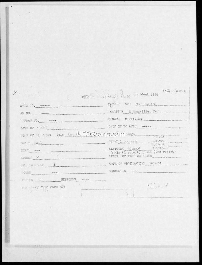 Incident #136 Sighting Report — South Knoxville, Tennessee, 30 June 1948