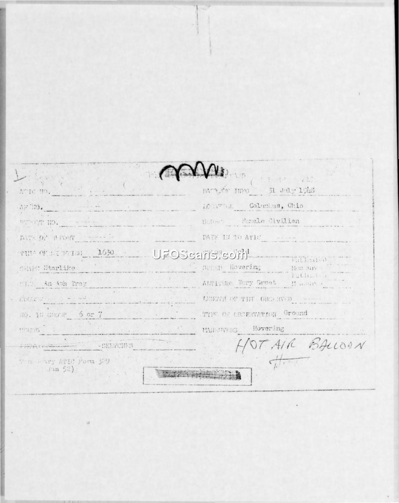 A 1948 ATIC sighting report from Columbus, Ohio, involving 6-7 gold, starlike objects. The report contains a handwritten note identifying the objects as a hot air balloon.