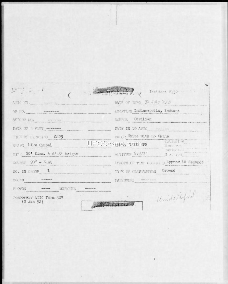 Incident #152 Sighting Report — Indianapolis, Indiana, 31 July 1948