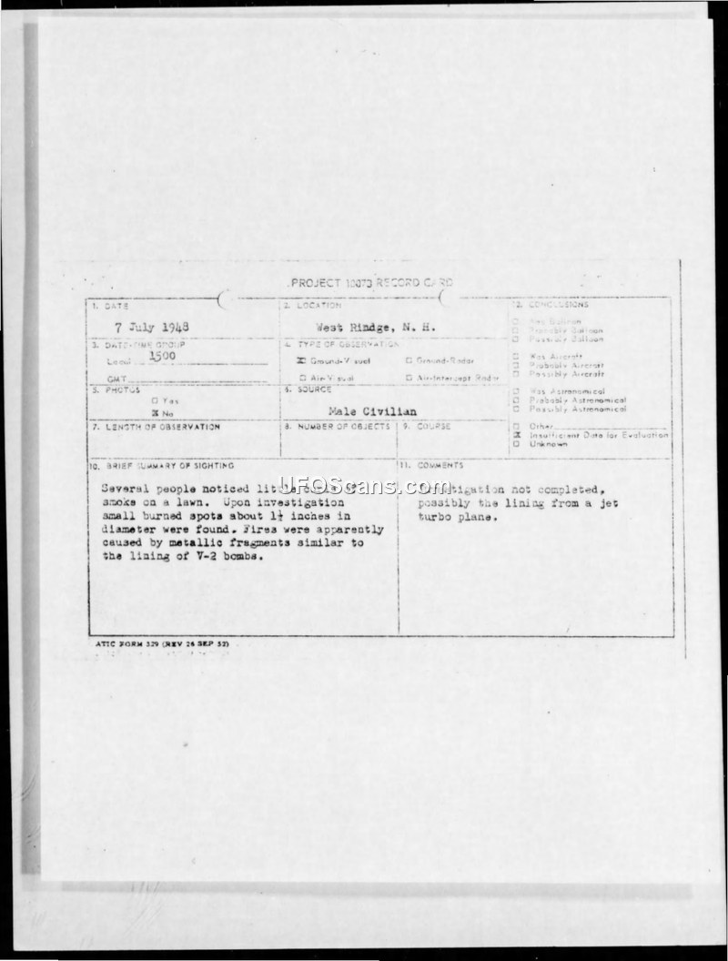This document collection details the investigation of Incident #214, which occurred on July 7, 1948, in West Rindge, New Hampshire. The incident involved the discovery of small, burned spots on a lawn, approximately 1.5 inches in diameter, caused by metallic fragments. The witness, a Vice President of the New England Telephone and Telegraph Company, reported the discovery of these fragments. Initial reports suggested the fragments might be related to V-2 bomb linings or jet turbo plane components. The Federal Bureau of Investigation (FBI) became involved, and the fragments were sent to the Massachusetts Institute of Technology (MIT) for spectrographic analysis. The analysis concluded that the fragments were composed of ordinary cast iron that had been subjected to extreme heat. The scientists at MIT determined that the fragments were likely part of a hollow cylinder, approximately 14 inches in diameter and 3/16 of an inch thick. The examination explicitly excluded the possibility that the fragments were meteoritic in origin. The document includes various administrative records, including correspondence between the Air Weather Service, the Air Material Command, and the FBI, regarding the status of the investigation. By November 1948, the Air Material Command requested further information from the FBI, though the final conclusion remained that the objects were man-made, likely industrial or military debris, rather than an unidentified aerial phenomenon. The incident was formally indexed under Project Grudge and Project Sign.