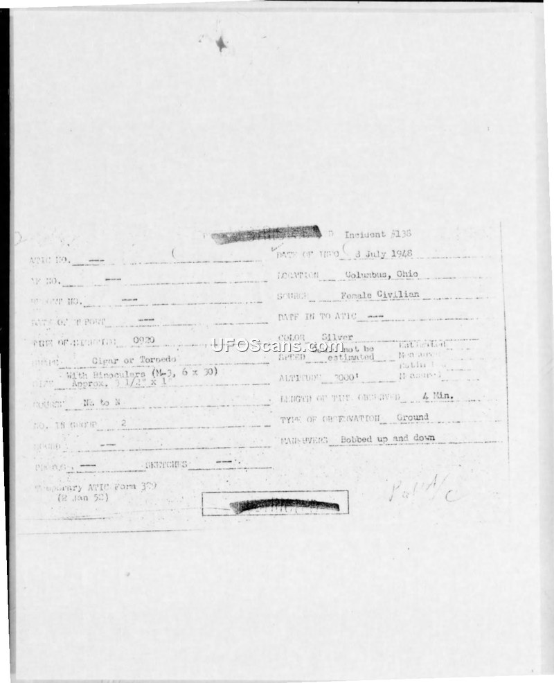 Incident #138 Sighting Report — Columbus, Ohio, 8 July 1948
