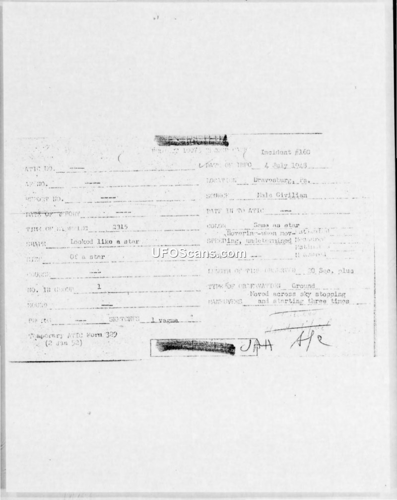 Incident #160 Sighting Report — Dravosburg, Pennsylvania, 4 July 1948