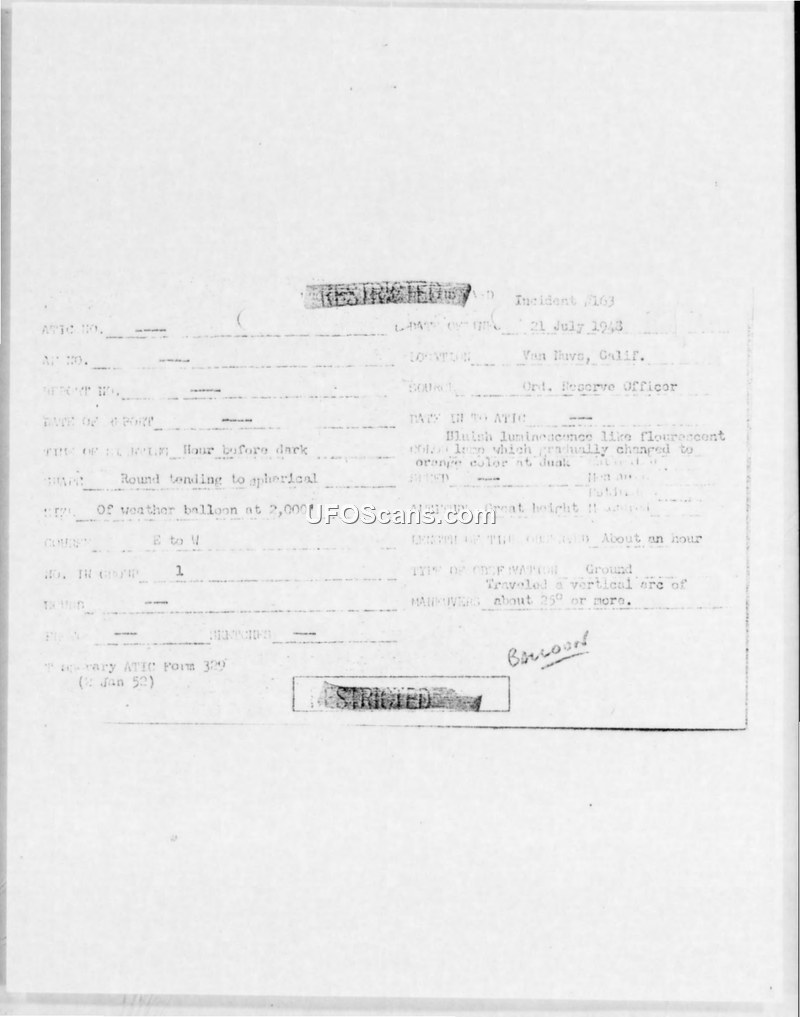 Incident #163 Sighting Report — Van Nuys, California, 21 July 1948