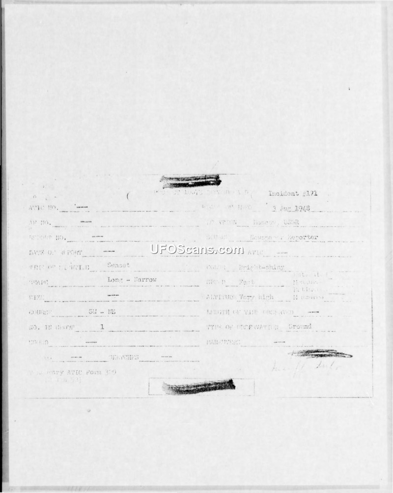 This document contains intelligence reports and correspondence regarding Incident #171, a sighting of an unidentified aerial object over Moscow, USSR, on 3 August 1948. The primary witness was an experienced American newspaper reporter who observed a long, narrow, bright, and shiny object at a very high altitude near sunset. The object moved in a southwest-northeast direction at a high but not excessive speed. The witness reported that the object appeared metallic, lacked visible wings, and made no sound. While a Russian acquaintance who also observed the object identified it as a rigid airship, the reporter doubted this conclusion due to the object's high speed. Official intelligence assessments from the Technical Intelligence Division concluded that there was no astronomical explanation for the sighting. Analysts suggested the object could have been a jet, a conventional airplane, or a dirigible, noting that atmospheric conditions and fore-shortening could cause aircraft to appear unusual. The document also references a broader context of Soviet interest in the American 'flying saucer' phenomenon, noting that the Central Party Committee in Moscow was conducting a secret study on the subject, as well as on reports of rockets over Sweden. The file includes internal correspondence between military intelligence offices regarding the need to continue follow-ups on such reports under the provisions of Project Sign.