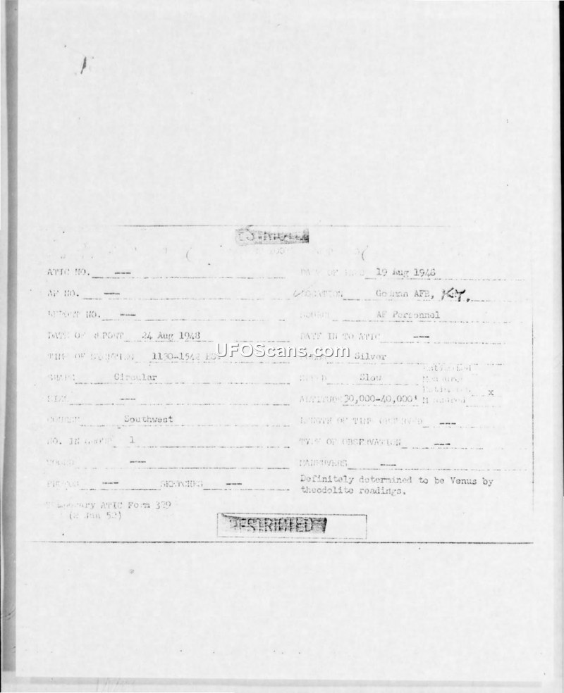 A 1948 sighting of a circular, silver object at Godman AFB was officially identified as the planet Venus via theodolite readings. The report was processed by the Air Technical Intelligence Center.