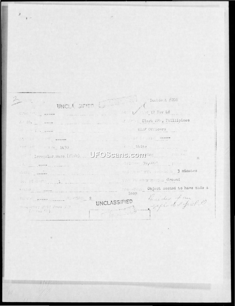 Incident #208 Sighting Report — Clark Air Force Base, Philippines, 17 November 1948