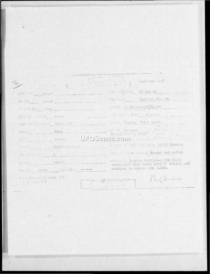 Incident #207 Sighting Report — Andrews Air Force Base, 18 November 1948