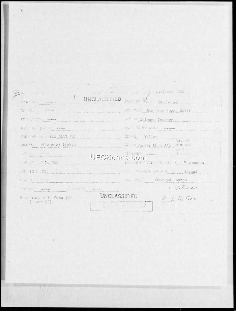 Incident #220 Sighting Report — San Francisco, California, 29 November 1948