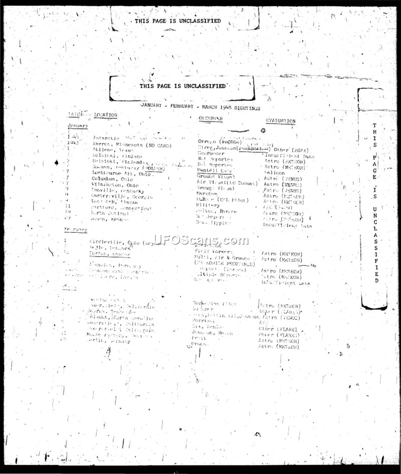 This document is a chronological log of UAP/UFO sightings reported during 1948. It categorizes each incident by date, location, observer, and official evaluation.
