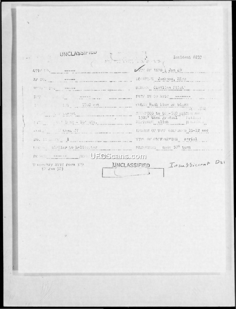 Incident #233 Sighting Report — Jackson, Mississippi, 1 January 1949