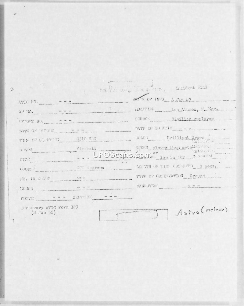 This document is a formal sighting report, designated as Incident #242, recorded on a Temporary ATIC Form 329 dated January 2, 1952. The report details an aerial observation that occurred on January 6, 1949, at 0310 MST in Los Alamos, New Mexico. The witness, identified only as a civilian employee, reported observing a single object described as a brilliant green fireball. The object was noted to be at a low altitude in the sky, traveling on a heading of 270 degrees. The duration of the sighting was estimated at two seconds. Regarding its speed, the report notes it was slower than a meteor. The document includes a handwritten annotation at the bottom right corner, which provides an official explanation for the event, identifying the object as an 'Astro (meteor)'. No photographs or film were taken of the incident, and no further details regarding radar contact or physical evidence are provided in the report.