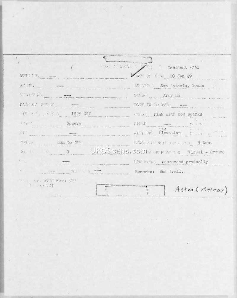 This report details a 1949 sighting of a luminous, spherical object with a trailing tail near San Antonio, Texas, by a military witness. The incident was officially categorized as an 'Astro (Meteor)' by the investigating authorities.
