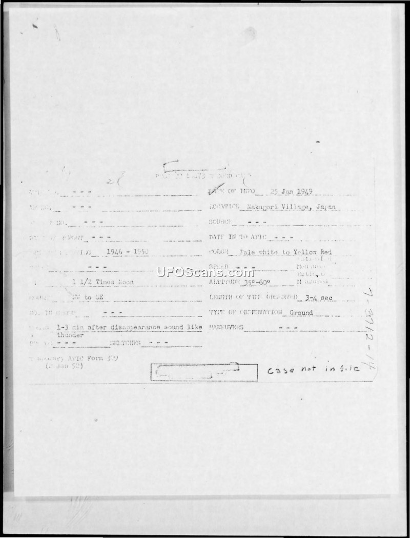A 1949 sighting report from Nakagori Village, Japan, describes a pale white to yellow-red object observed for 3-4 seconds. The report is marked as 'case not in file' by ATIC.