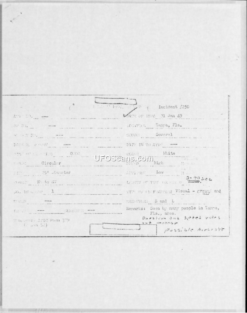 Incident #250 Sighting Report — Tampa, Florida, 31 January 1949