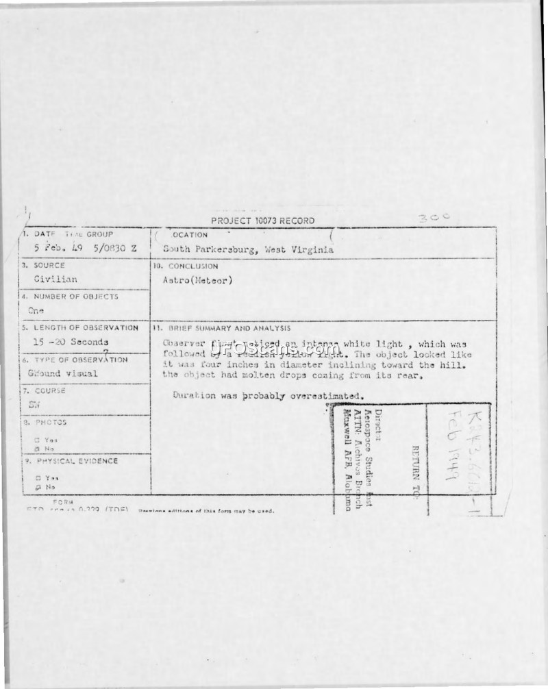 Project 10073 Record — Incident #300, Parkersburg, West Virginia, 5 February 1949