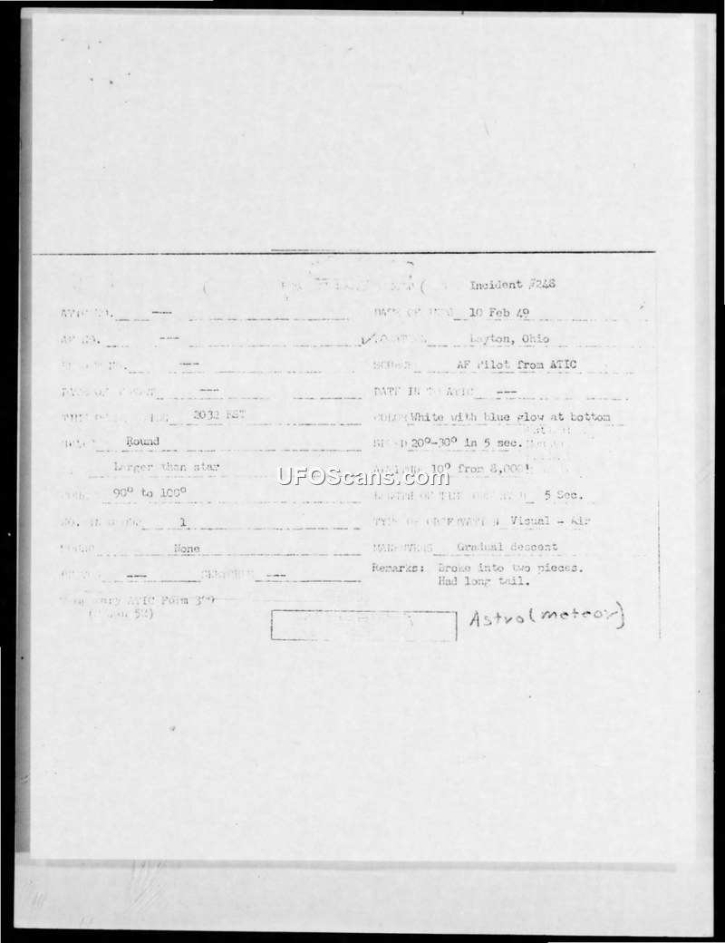 The object was observed by two pilots at 2032 hours on 10 February 1949. It appeared as a brilliant white light with a blue glow, descending gradually before breaking into two pieces and disintegrating. The official conclusion recorded on the ATIC form is 'Astro (meteor)'.