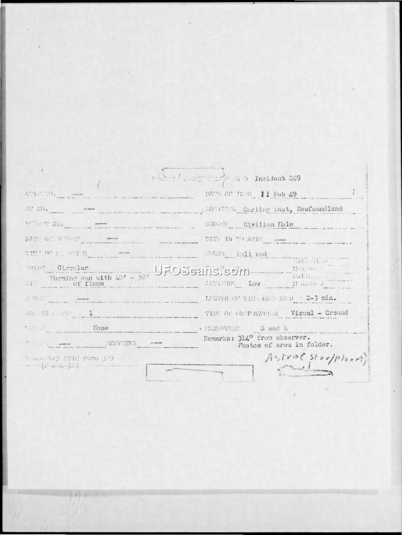 Incident #249 Sighting Report — Curling East, Newfoundland, February 1949