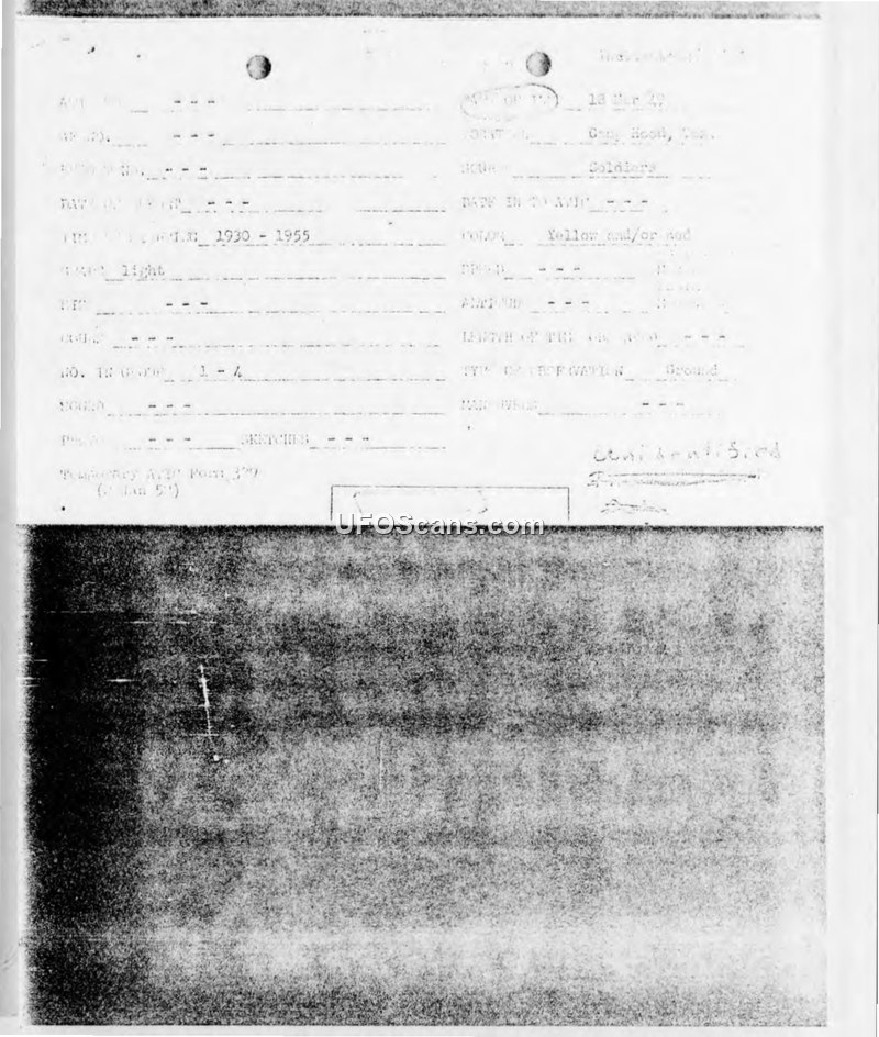 Multiple sightings of unidentified yellow and red lights were reported by military personnel at Camp Hood, Texas, between 18 and 19 March 1949. Despite investigations by the Alert Force and special agents, no source for the lights was identified.