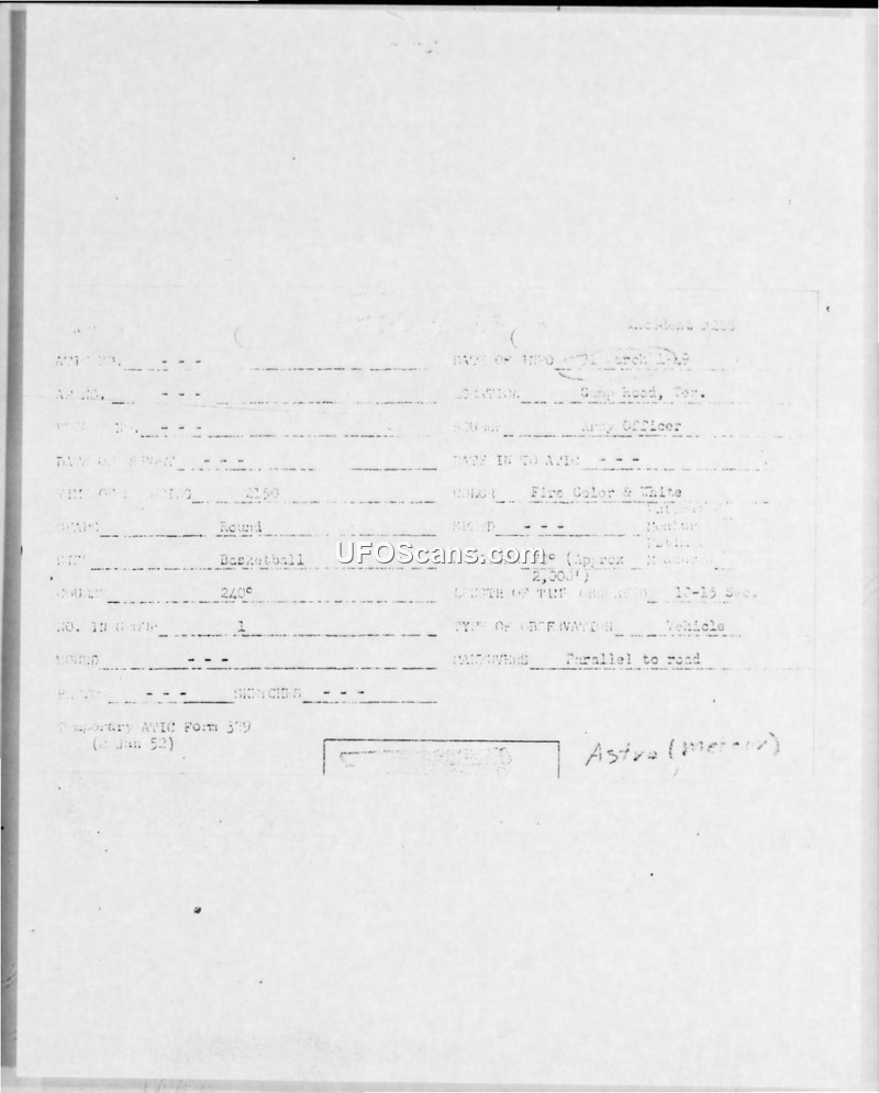 A 1st Lieutenant observed a round, basketball-sized object with a fire-colored trail over Camp Hood, Texas, on 31 March 1949. The sighting was accompanied by significant radio interference, and the report was forwarded to the Air Materiel Command for investigation.